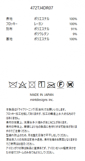 素材:MAIN:POLYESTER 100% FLOCKY:RAYON 100% OTHER:POLYESTER 91% POLYURETHANE 9% LINING:POLYESTER 100% (原産国:日本)