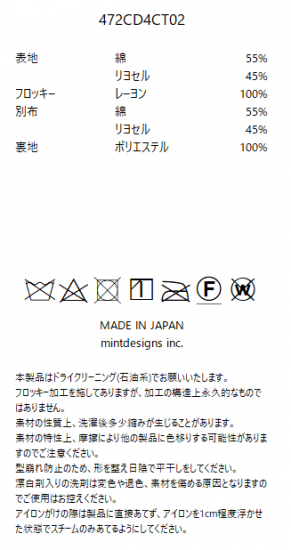 素材:MAIN:COTTON 55% LYOCELL 45% FLOCKY:RAYON 100% OTHER:COTTON 55% LYOCELL 45% LINING:POLYESTER 100% (原産国:日本)
