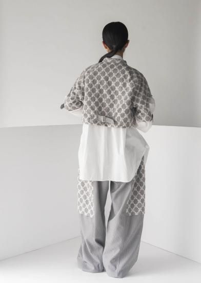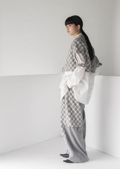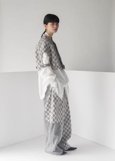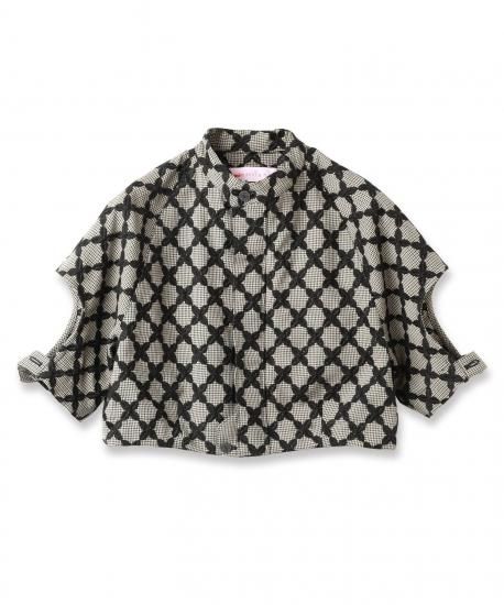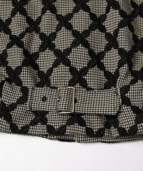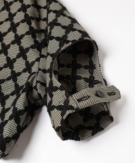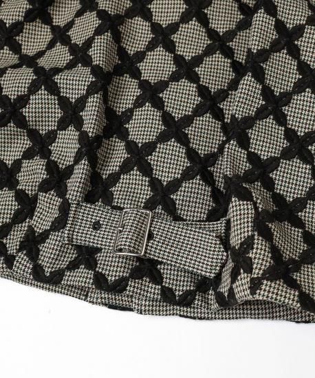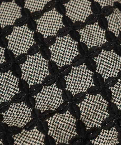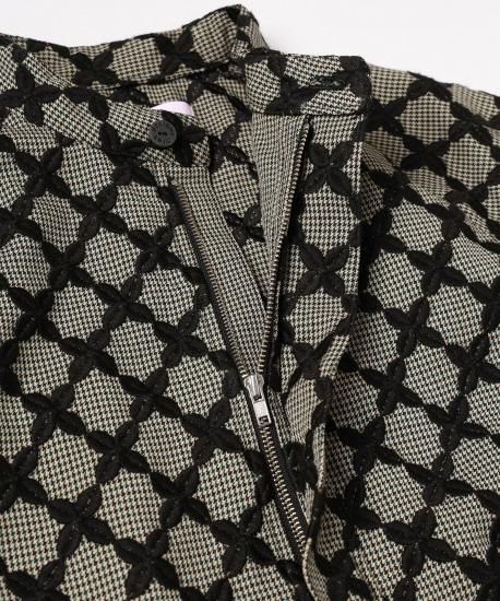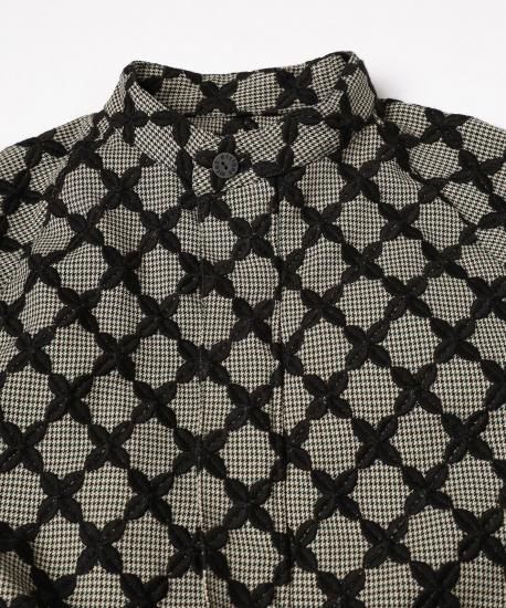 オリジナルテキスタイル"Mix Check" 特別感のある刺繍生地は福井の刺繍工場で製作しました。千鳥チェック柄の生地の上からクロス柄をオーバー刺繍しています。糸はウール糸を使う事で立体感を出しています。2つの異なる柄と素材が立体感を生み出し、ユニークで新しいチェック柄に仕上がりました。形はコンパクトなシルエットのジャケットです。ニットやシャツなど、シーズンによって合わせるものを変えて楽しむ事ができます。