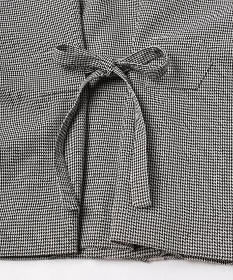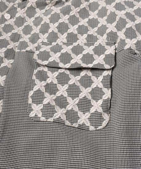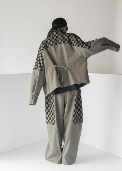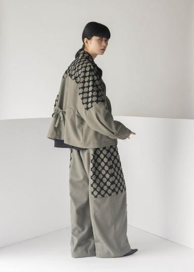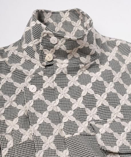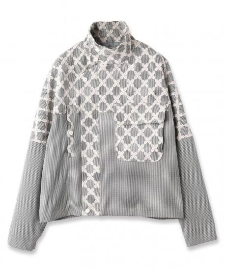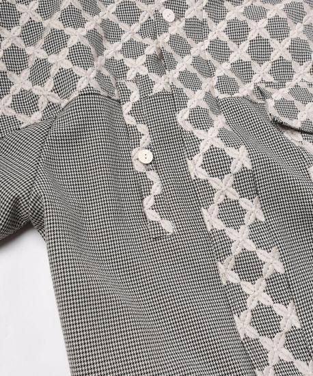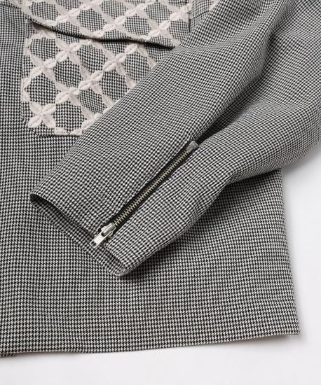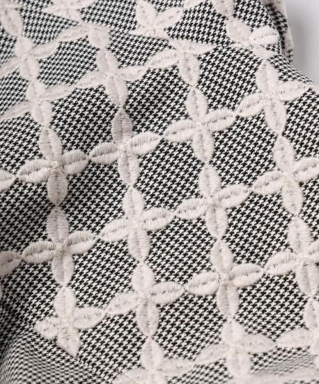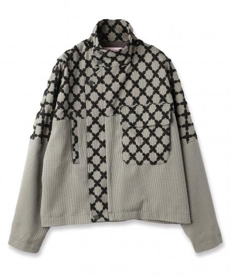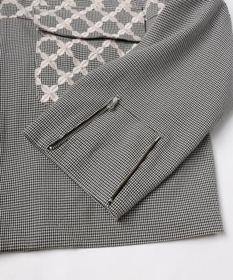 オリジナルテキスタイル"Mix Check" 特別感のある刺繍生地は福井の刺繍工場で製作しました。千鳥チェック柄の生地の上からクロス柄をオーバー刺繍しています。糸はウール糸を使う事で立体感を出しています。2つの異なる柄と素材が立体感を生み出し、ユニークで新しいチェック柄に仕上がりました。形はアーチシルエットのアウターです。刺繍生地と千鳥格子の生地の切り替えがデザインのアクセントになっています。