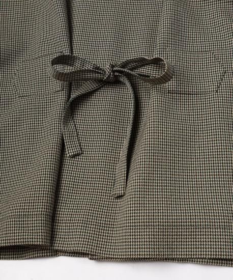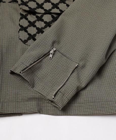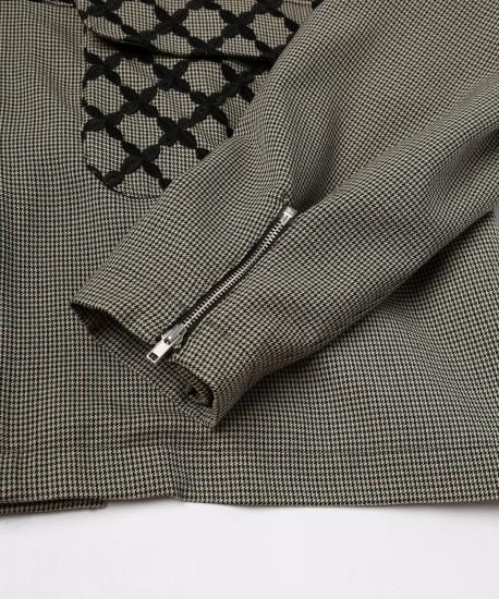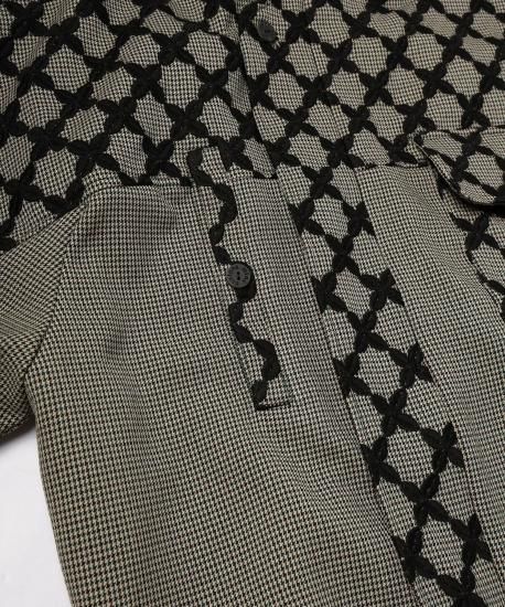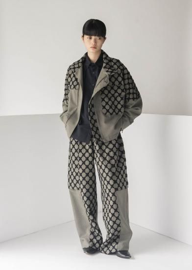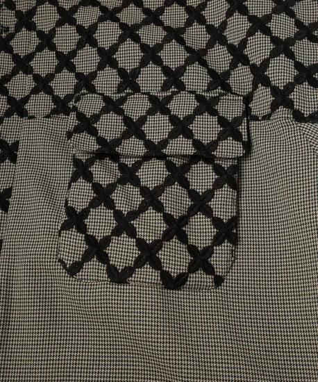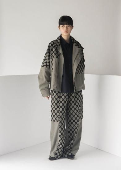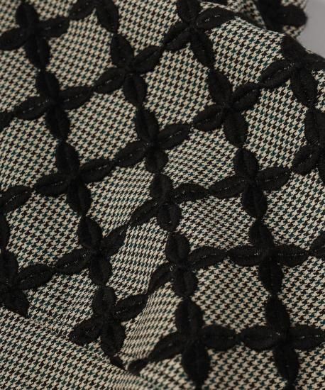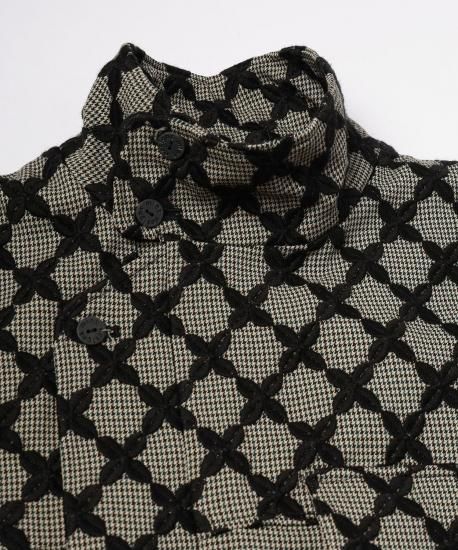 オリジナルテキスタイル"Mix Check" 特別感のある刺繍生地は福井の刺繍工場で製作しました。千鳥チェック柄の生地の上からクロス柄をオーバー刺繍しています。糸はウール糸を使う事で立体感を出しています。2つの異なる柄と素材が立体感を生み出し、ユニークで新しいチェック柄に仕上がりました。形はアーチシルエットのアウターです。刺繍生地と千鳥格子の生地の切り替えがデザインのアクセントになっています。