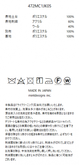 素材:BASE:POLYESTER 100% EMBROIDERY:ACLYLIC 60% WOOL 40% OTHER:POLYESTER 100% LINING:POLYESTER 100% (原産国:日本)