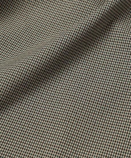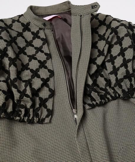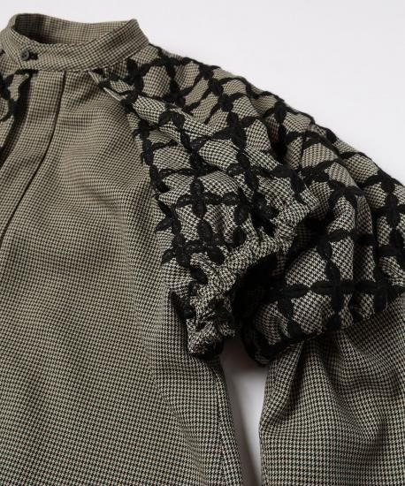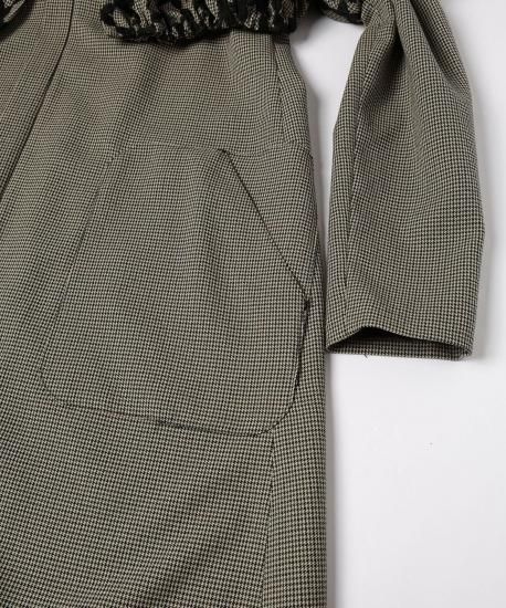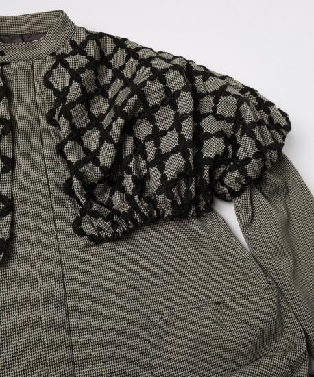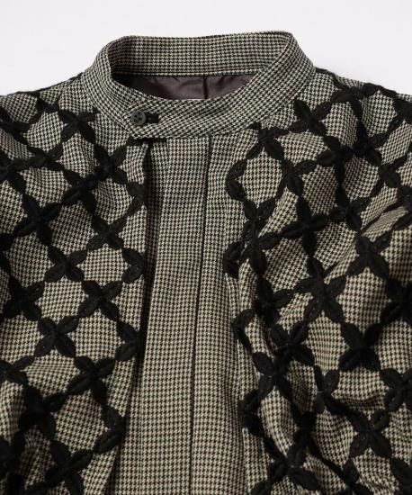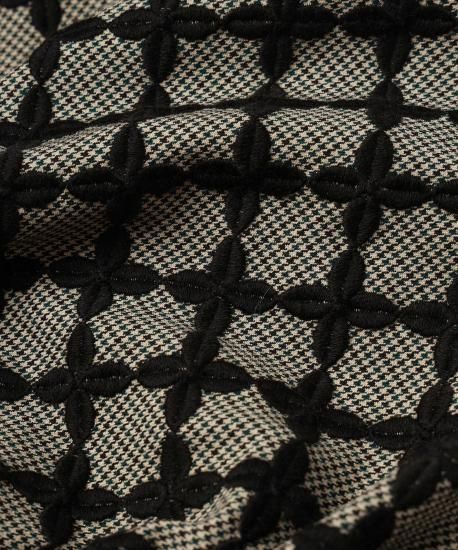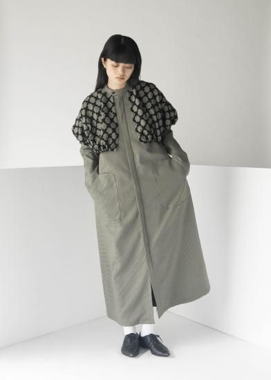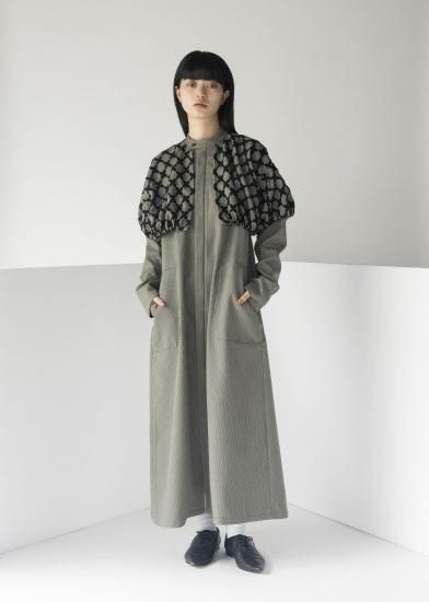 オリジナルテキスタイル"Mix Check" 特別感のある刺繍生地は福井の刺繍工場で製作しました。千鳥チェック柄の生地の上からクロス柄をオーバー刺繍しています。糸はウール糸を使う事で立体感を出しています。2つの異なる柄と素材が立体感を生み出し、ユニークで新しいチェック柄に仕上がりました。形は刺繍生地と千鳥格子の生地の切り替えがアクセントになっているドレスコートです。ドレスとしても、羽織りとしてもお楽しみいただけます。