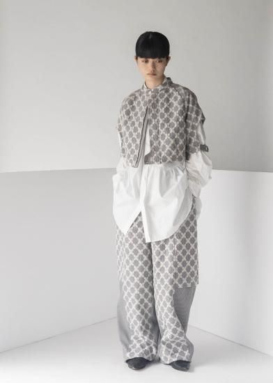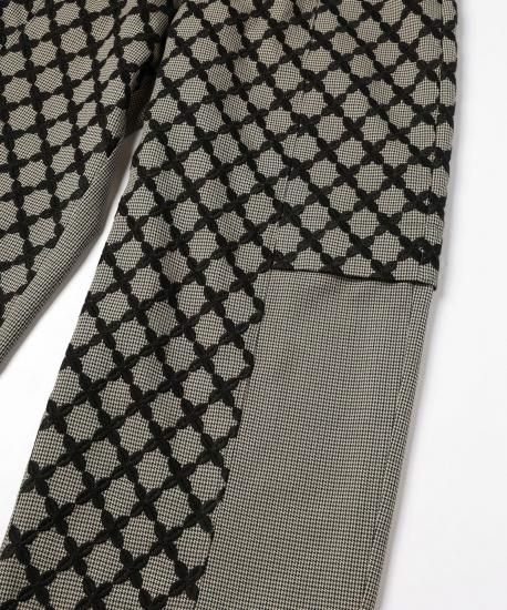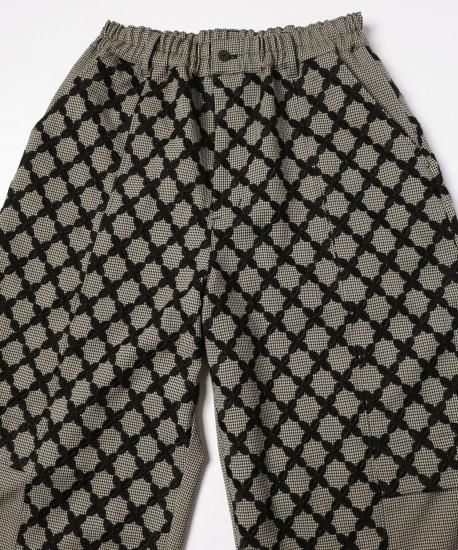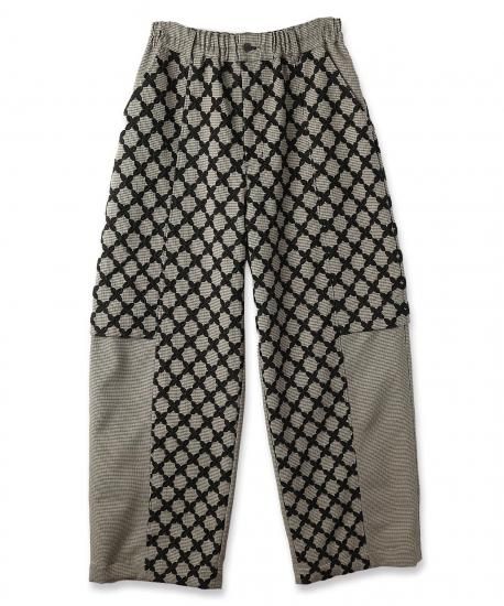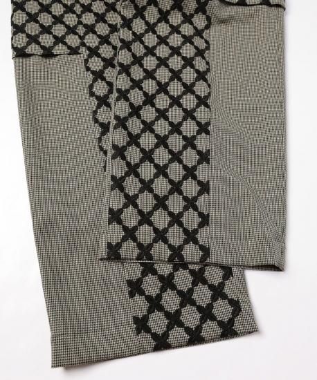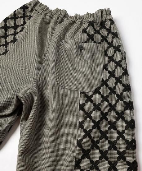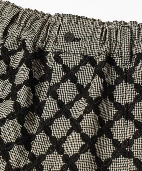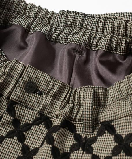 オリジナルテキスタイル"Mix Check" 特別感のある刺繍生地は福井の刺繍工場で製作しました。千鳥チェック柄の生地の上からクロス柄をオーバー刺繍しています。糸はウール糸を使う事で立体感を出しています。2つの異なる柄と素材が立体感を生み出し、ユニークで新しいチェック柄に仕上がりました。形はオーバル型のシルエットでボリュームたっぷりのパンツになります。刺繍生地と千鳥格子の生地の切り替えがデザインのアクセントになっています。