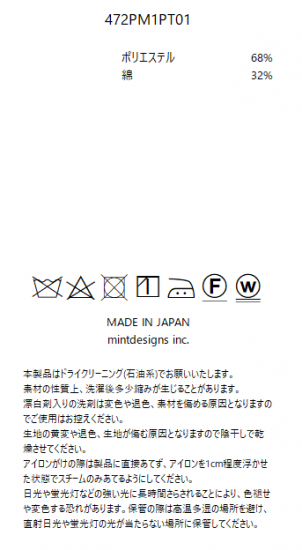 素材:MAIN:POLYESTER 68% COTTON 32% (原産国:日本)