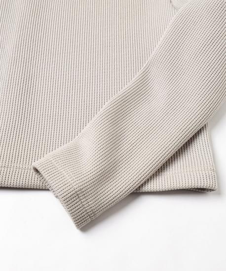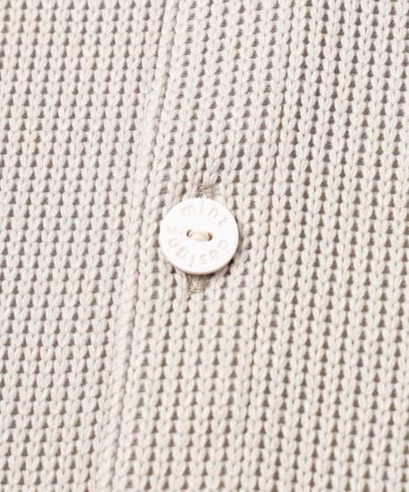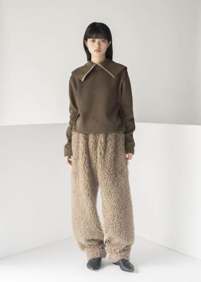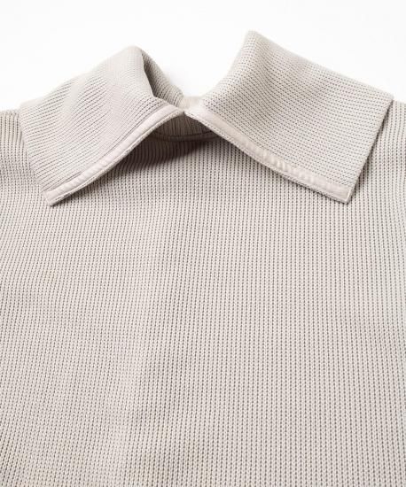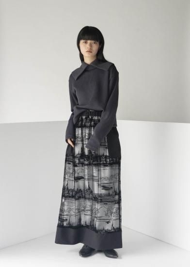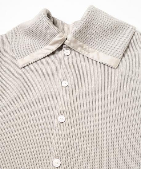 ローゲージとハイゲージを裏表で合わせたジャージー素材です。とても軽く、形崩れしないのが特徴です。ダンボの耳のように大きな襟がデザインポイントです。前開きを前にしてカーディガンとして、開きを後ろにしてトップスとして、と前後ろ両方で着用できるようにお作りしています。