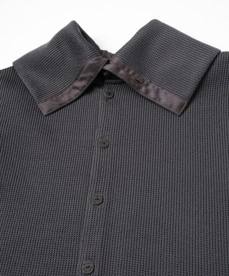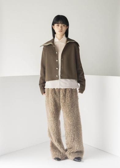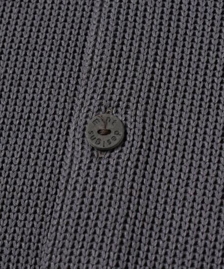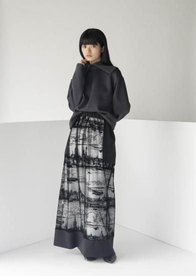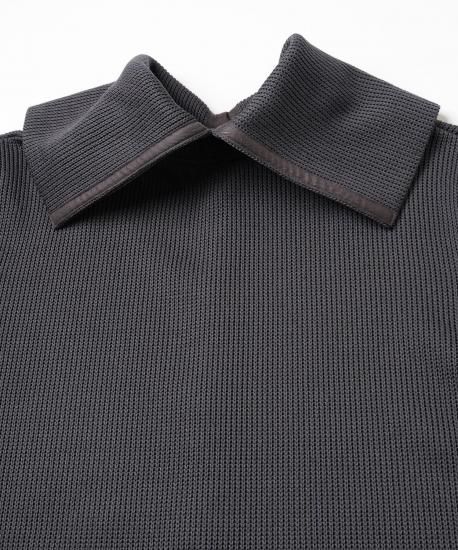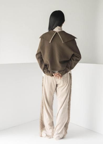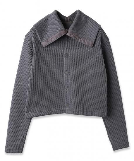 ローゲージとハイゲージを裏表で合わせたジャージー素材です。とても軽く、形崩れしないのが特徴です。ダンボの耳のように大きな襟がデザインポイントです。前開きを前にしてカーディガンとして、開きを後ろにしてトップスとして、と前後ろ両方で着用できるようにお作りしています。