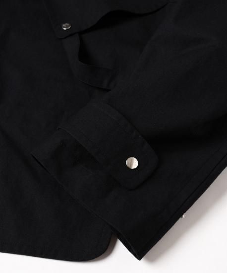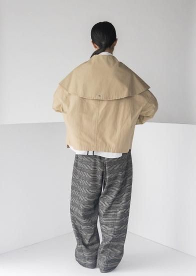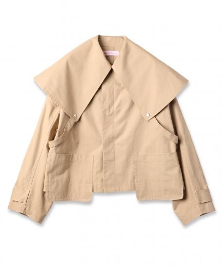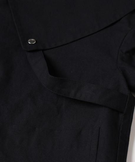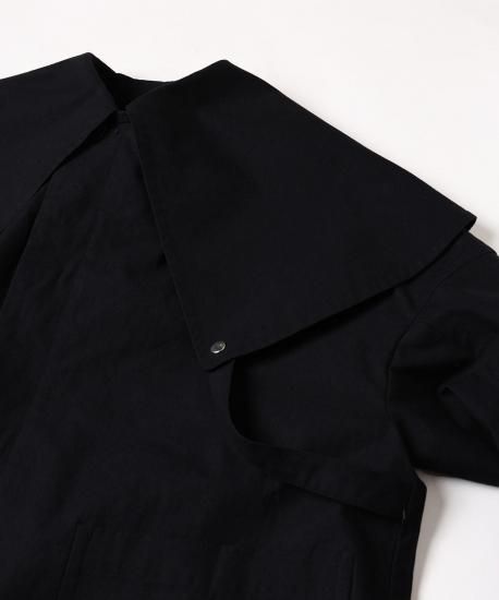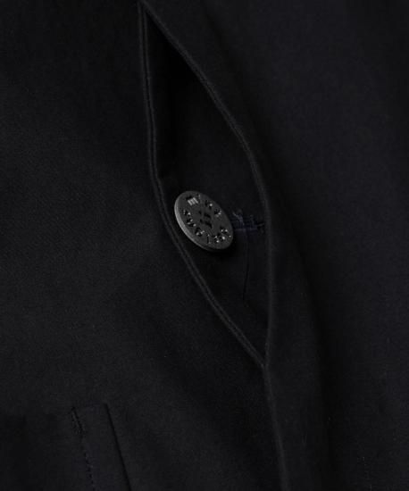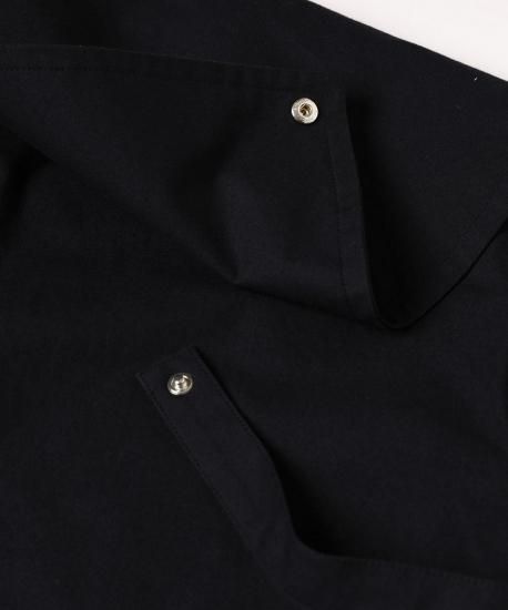 ダンボの耳のように大きな襟は風よけマントのような役割があります。襟部分を止めるためのストラップもデザインのアクセントになっています。素材はブランド定番の馬布。乗馬用に使われる、風邪やホコリを通さない、目の詰まったコットン素材です。前回一瞬で売り切れてしまった人気アイテムを新色の黒を加えて再生産します。