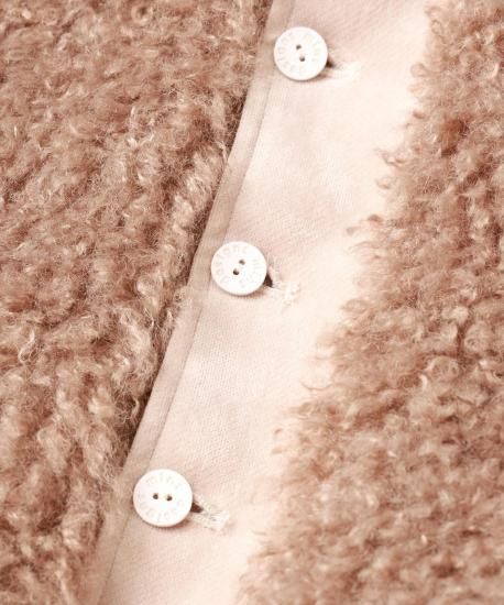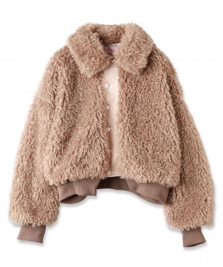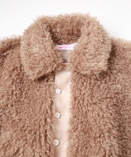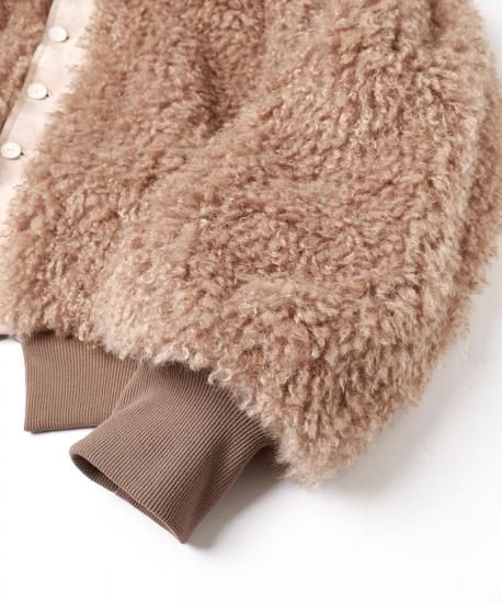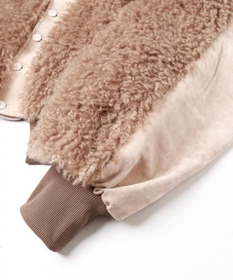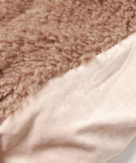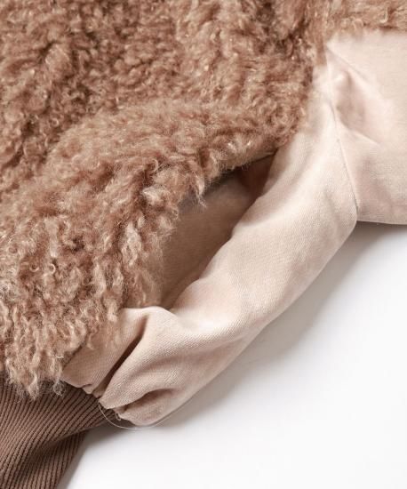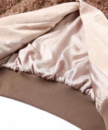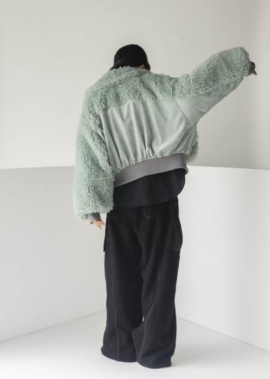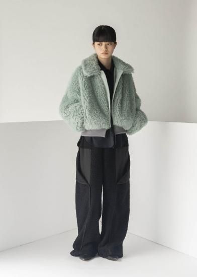触るとびっくりするほどの軽さと柔らかさ、暖かさのあるファー素材です。形はボリュームたっぷりのブルゾンです。後ろ身頃の切り替えで合わせたのはベルベットのように美しい上品な光沢の別珍素材です。