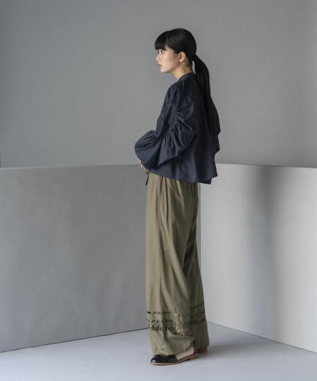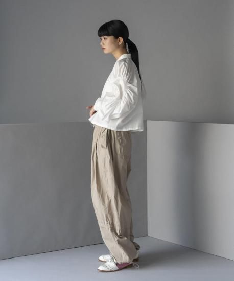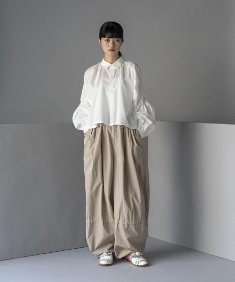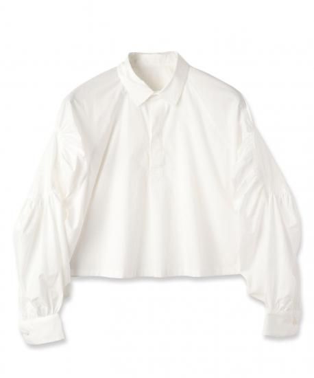 スリーブにボリュームを持たせたサークル状のギャザーがデザインアクセントのプルオーバーシャツです。ワッシャー加工を施したしなやかなシャツ地で仕立てており、自然な落ち感が美しい仕上がりになりました。洗いざらしでも様になる一品です。