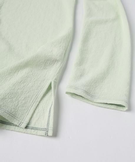 シャーベットのような半透明で淡い色彩で涼しげな印象のトップスです。凹凸感とさらりとした肌触りにストレッチ性を持たせた素材を使用。前身頃の切り替えにステッチを効かせてアクセントにしています。程よいゆとりを持たせつつ、細長いシルエットに見せるカッティングにこだわった一品です。