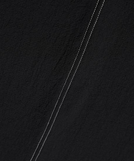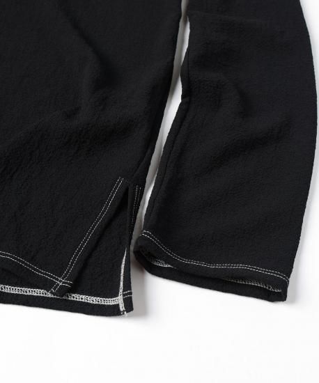 シャーベットのような半透明で淡い色彩で涼しげな印象のトップスです。凹凸感とさらりとした肌触りにストレッチ性を持たせた素材を使用。前身頃の切り替えにステッチを効かせてアクセントにしています。程よいゆとりを持たせつつ、細長いシルエットに見せるカッティングにこだわった一品です。