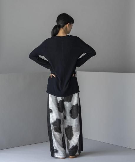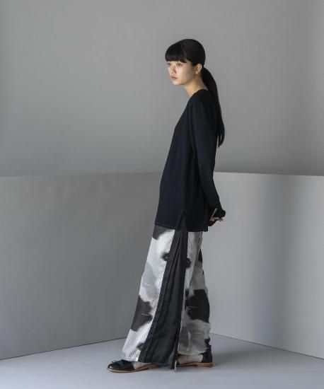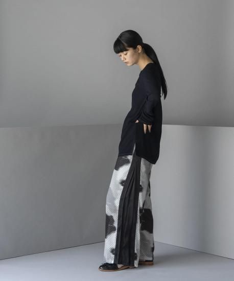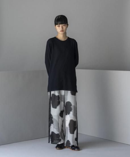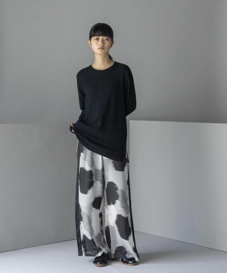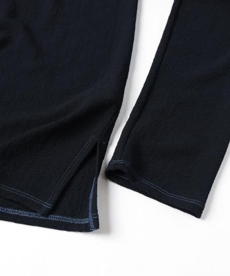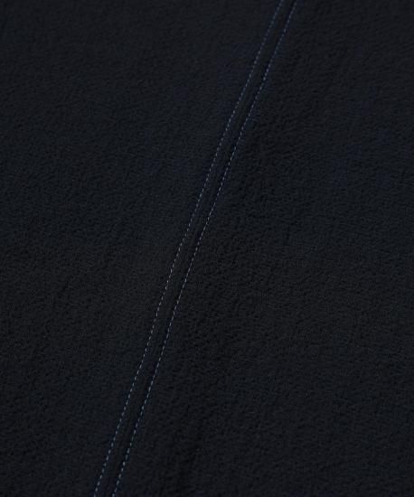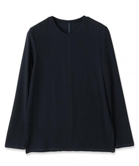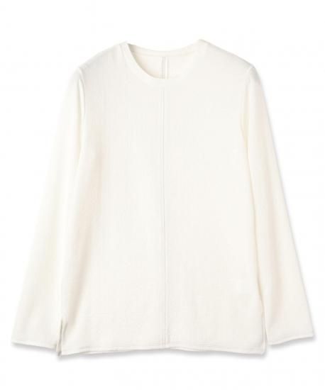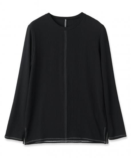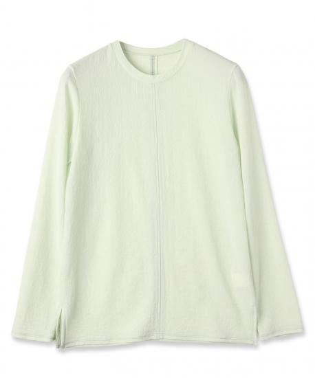 シャーベットのような半透明で淡い色彩で涼しげな印象のトップスです。凹凸感とさらりとした肌触りにストレッチ性を持たせた素材を使用。前身頃の切り替えにステッチを効かせてアクセントにしています。程よいゆとりを持たせつつ、細長いシルエットに見せるカッティングにこだわった一品です。