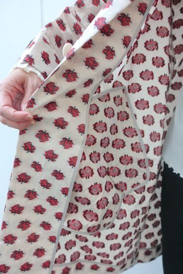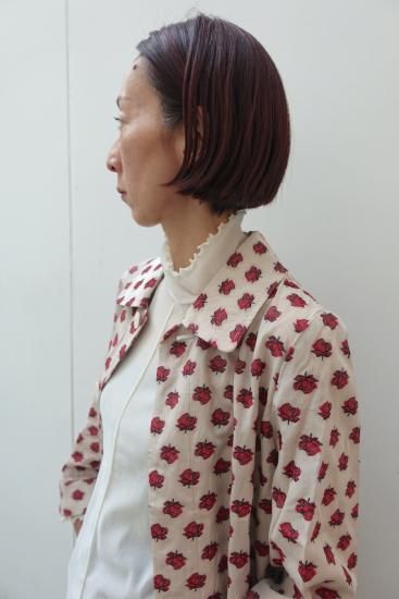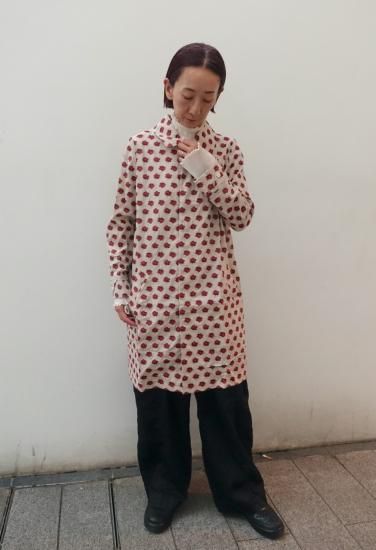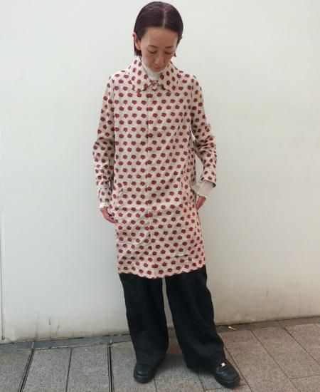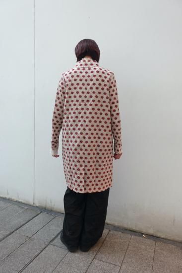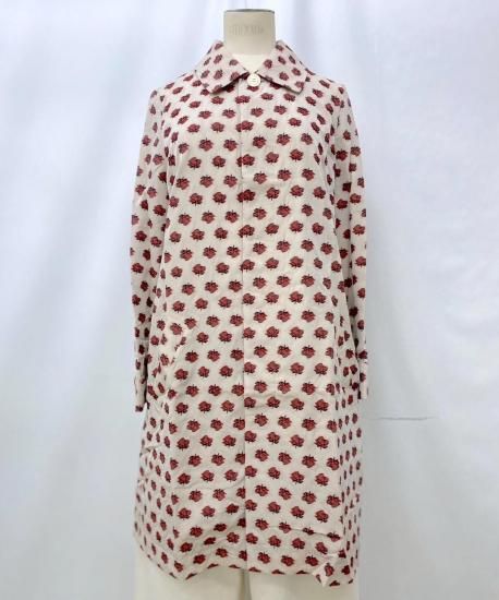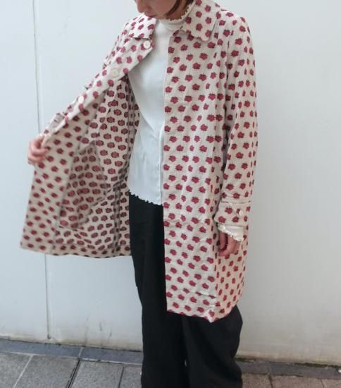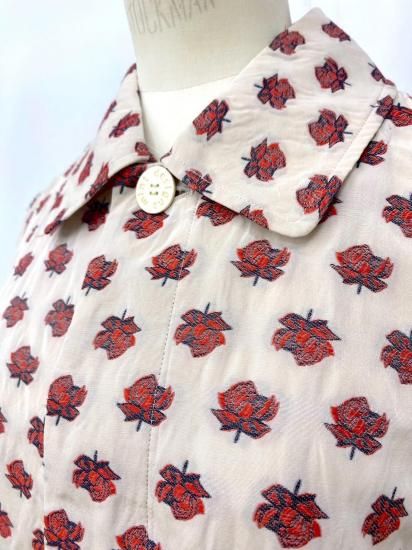 コレクションタイトル"smoke"からの逸品。バラの花を膨れ織りで立体的に表現したジャガード素材でステンカラーコートを作りました。当時もとても人気の高かったバラジャガードのシリーズです。