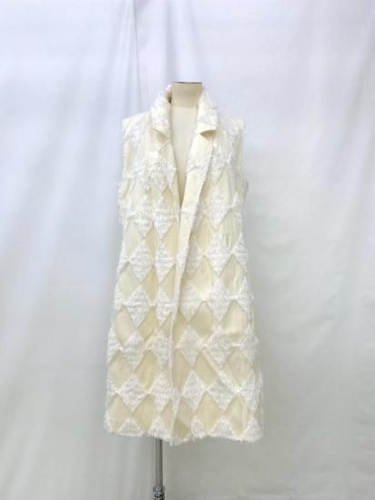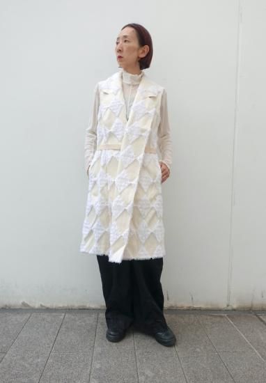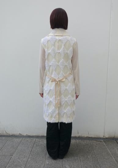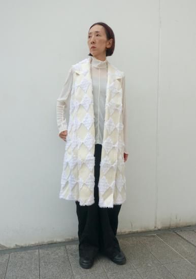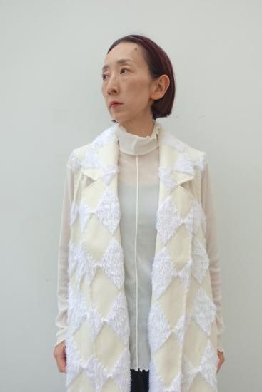 コレクションタイトル"VERTIGO"からの逸品。柔らかい毛先の糸がヘアリーなカットジャガードです。上品な白とオフホワイトで柄を表現しています。紐づかいでニュアンスの違う着こなしを楽しめます。