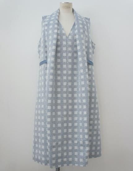 コレクションタイトル"VERTIGO"からの逸品。ショールカラーの襟が付いているような立体的な作りのドレスです。素材は透明なフィルム糸が浮き出るように織り込んだカットジャガード生地です。他ではみないような特別な素材です。