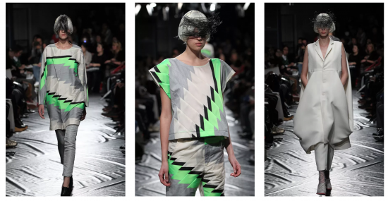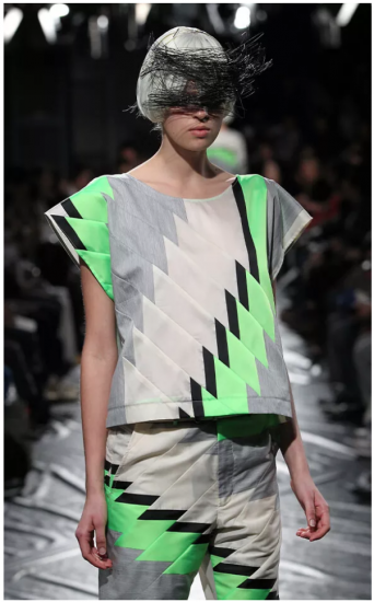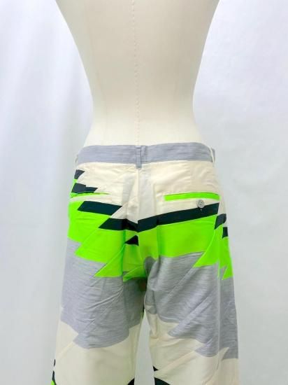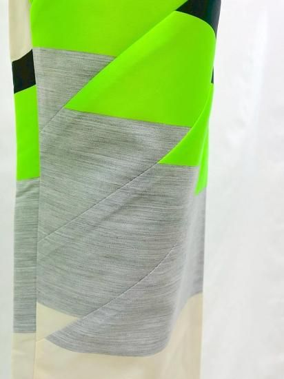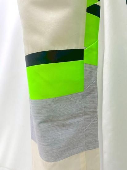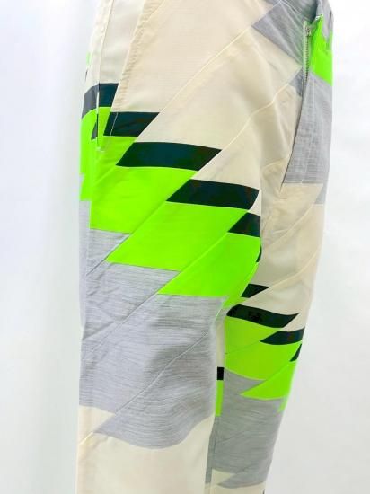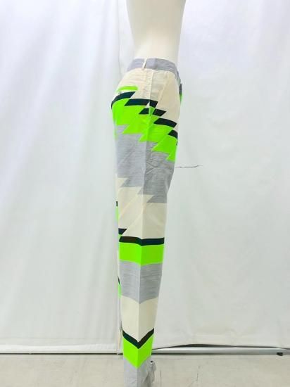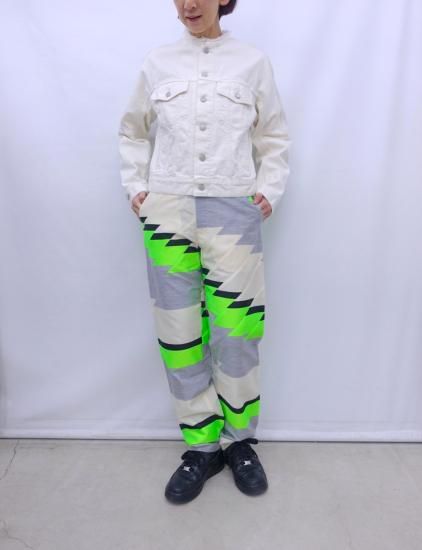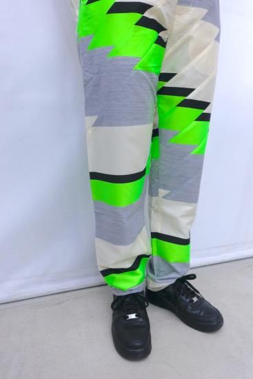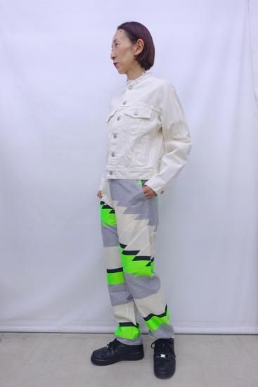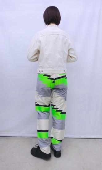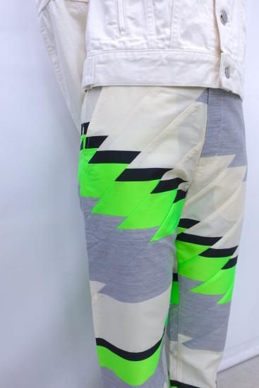 コレクションタイトルは"the darkside issue"ポップなミントデザインズの裏側、シリアスでダークな一面を表現したコレクションです。このパンツは蛍光グリーンのボーダーに織ったものをカッティングでジグザグ柄になるように縫い合わせた、技ありの一品です。