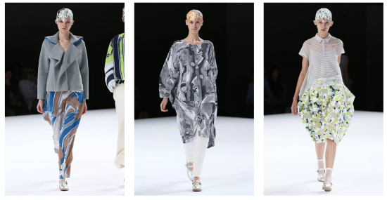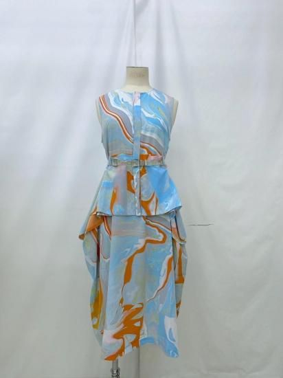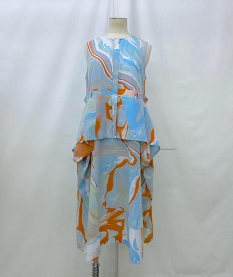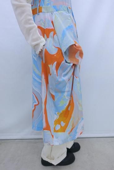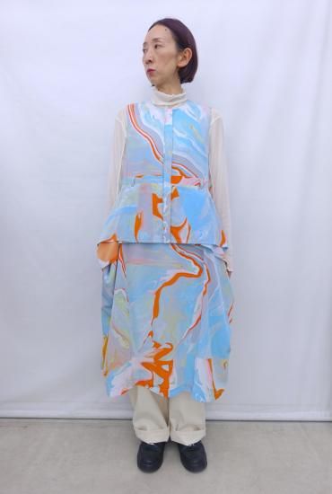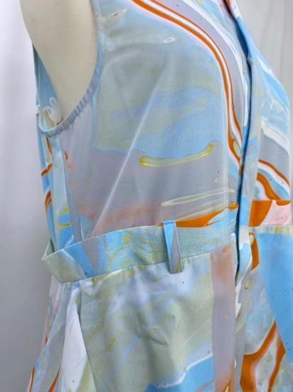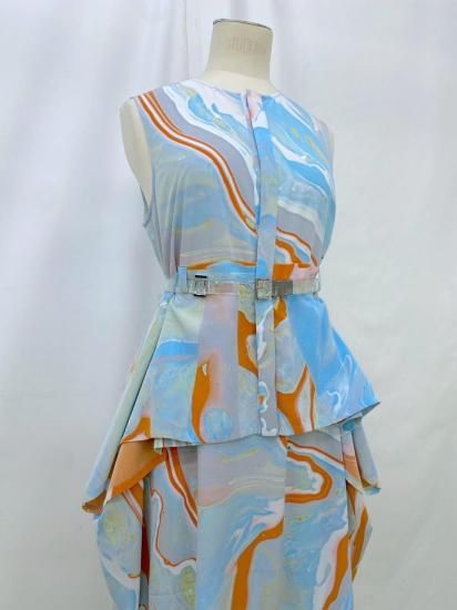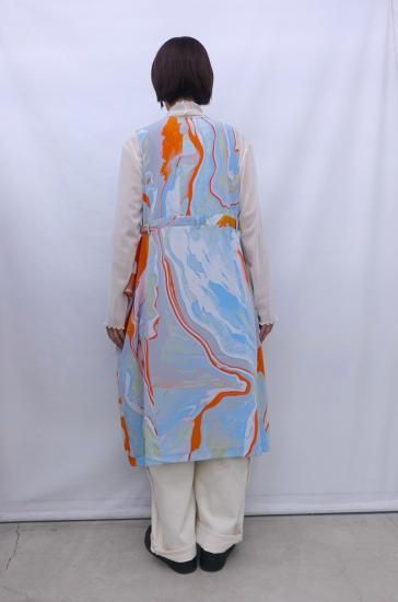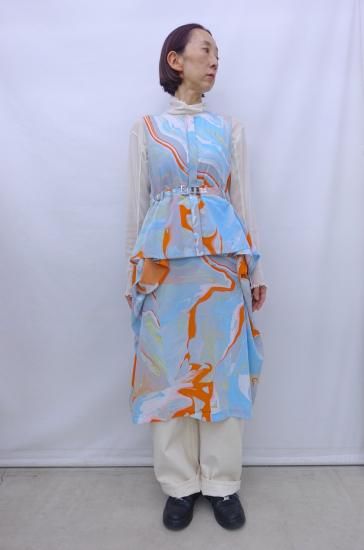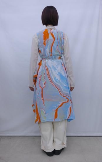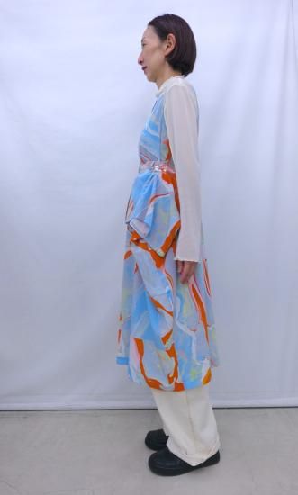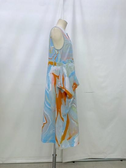 コレクションタイトル"VERTIGO"からの逸品。タイトルを直訳すると「めまい」。色のマーブルの渦巻がコレクションテーマを表現しています。実際にインクで何度もマーブル模様を作り出し、コラージュして作り上げたマーブル柄です。しなやかなタッチの素材でドレープが美しいドレスになっています。