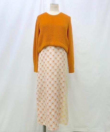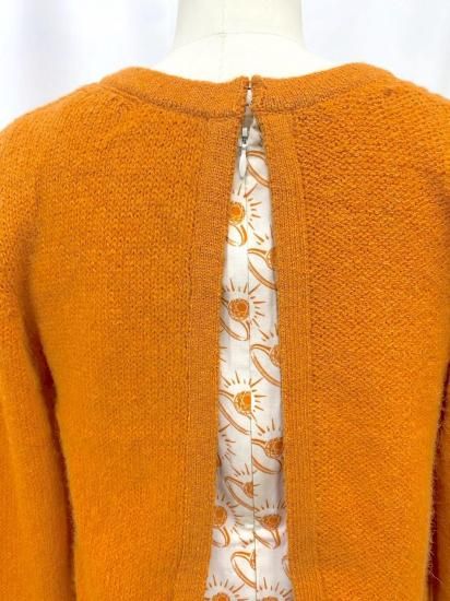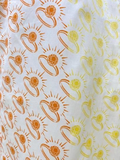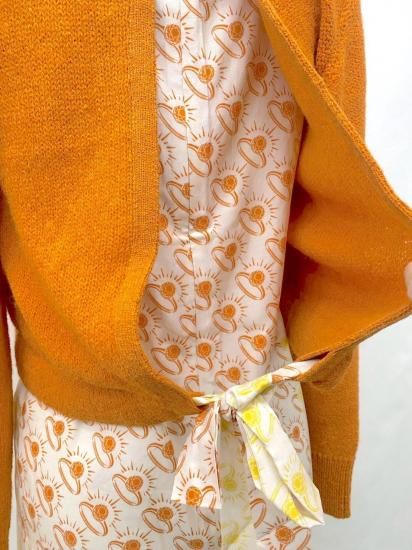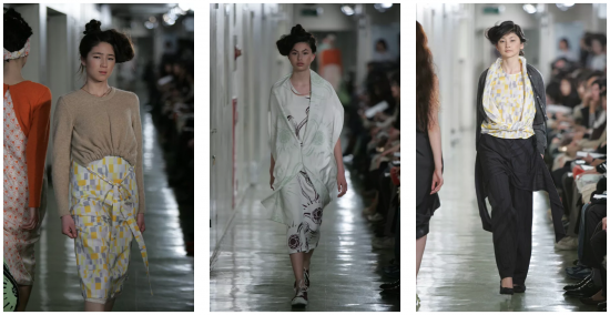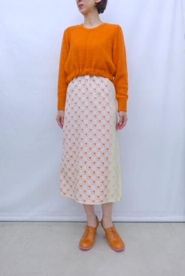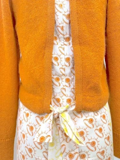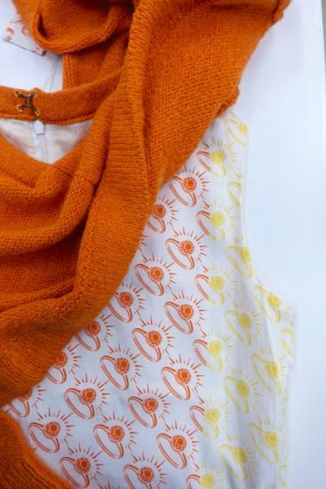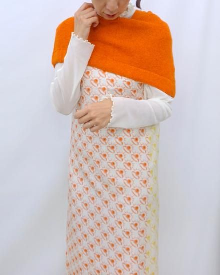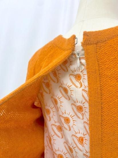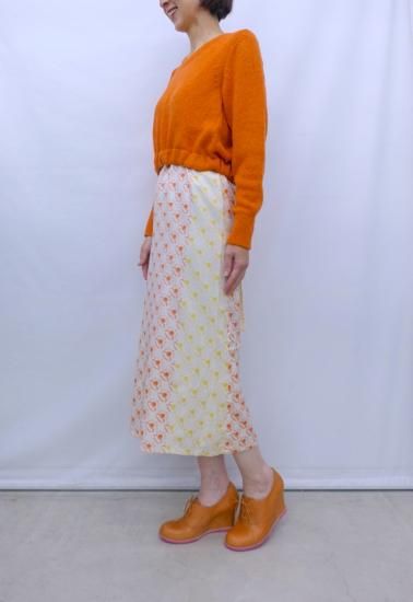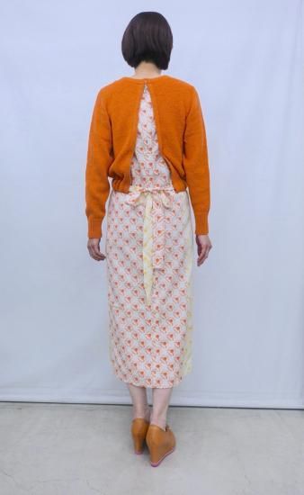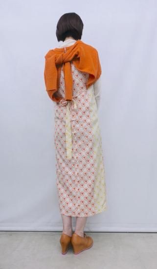 コレクションテーマは" moving in a square"。風呂敷がイメージソースとなったコレクションです。このコレクションで生まれたリング柄は、ダイヤモンドのリングを風呂敷で包んで運ぶ、というストーリーから生まれました。このドレスはニットと布帛の組み合わせです。ニット部分は今では貴重なアルパカ100%を使用。スカート部分もシルクコットンを使用しているという、贅沢な組み合わせです。