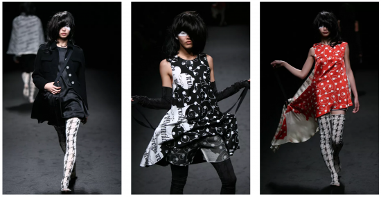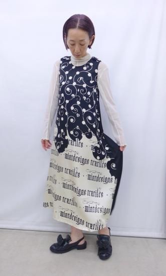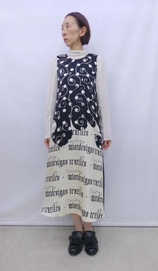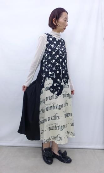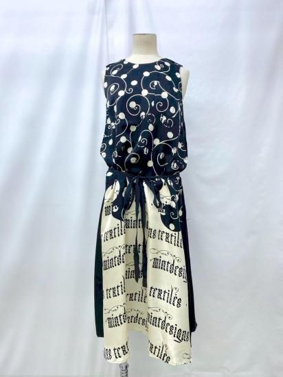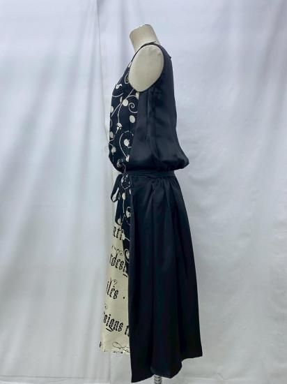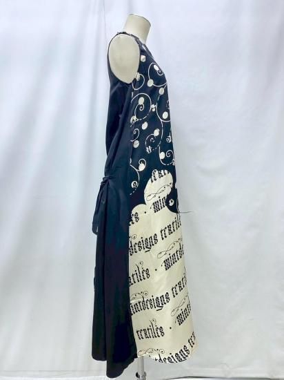 コレクションテーマは”composing project"。音楽をテーマにしたコレクションです。昔の楽譜に使われていたイメージの書体が描かれたシルクのドレスです。後ろに付いているリボンを肩から吊るすことでドレープを作るデザインになっています。