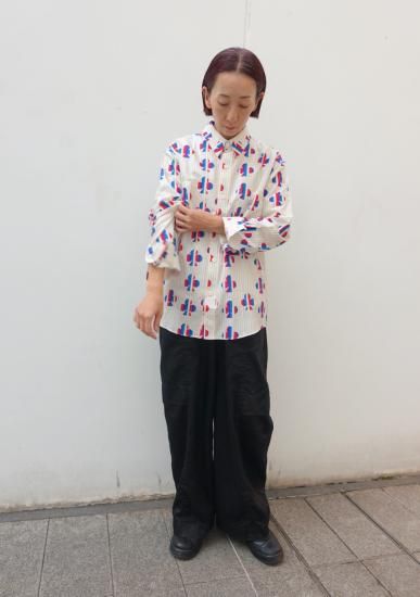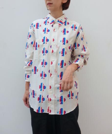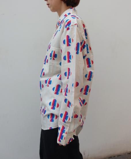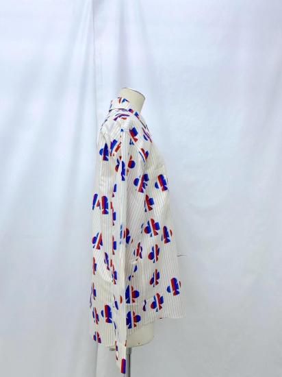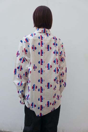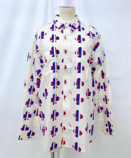 ブランド3年目のコレクションの作品です。テーマは"tri-colombian project"。「トリコロールカラー」とロンドンにあるフラワーマーケット、「Colombian Marcket」をかけたテーマです。コレクションテーマのトリコロールカラーでプリントしたクローバー柄のシャツです。サイズはユニセックスで着用可能なシャツです。